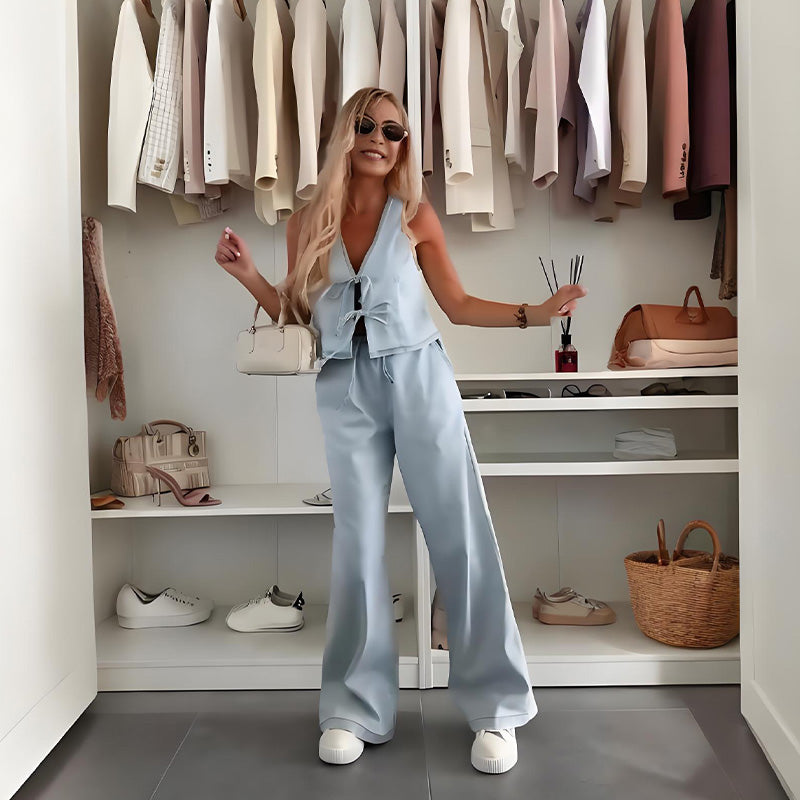 ELEGANT V-NECK SILHOUETTE - De diepe V-hals verlengt je halslijn voor een flatterende look. In combinatie met een delicaat strikdetail op de borst combineert deze set verfijning met speelse charme voor een veelzijdige styling.