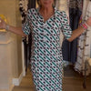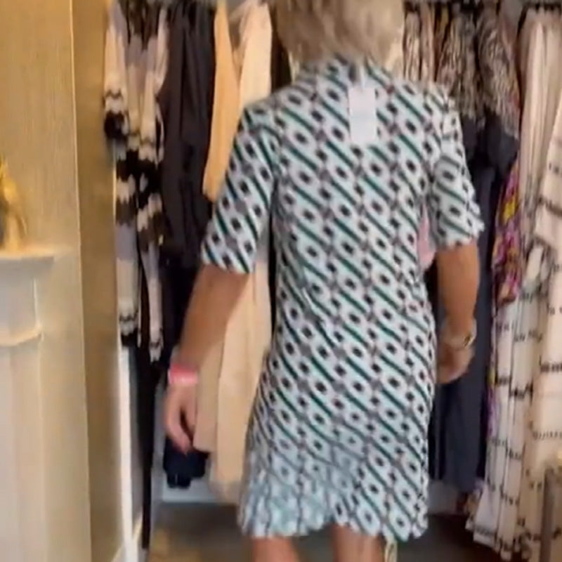 OPVALLENDE GEOMETRISCHE PRINT MET Nauwkeurige AFSTAND - Deze jurk heeft levendige geometrische patronen die naadloos over de naden lopen. Onze geavanceerde printtechnologie zorgt voor een perfecte afstemming van het patroon op elke naad, waardoor het scherpe contrast en de rijke kleuren zelfs na meerdere wasbeurten behouden blijven. De hoogwaardige inkten zijn bestand tegen vervagen, barsten en afbladderen, waardoor het ontwerp fris en opvallend blijft na verloop van tijd.