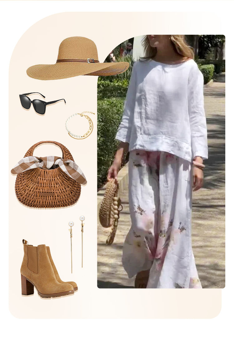 🌸🔥Tweedelige set met effen top en gebloemde broek met wijde pijpen