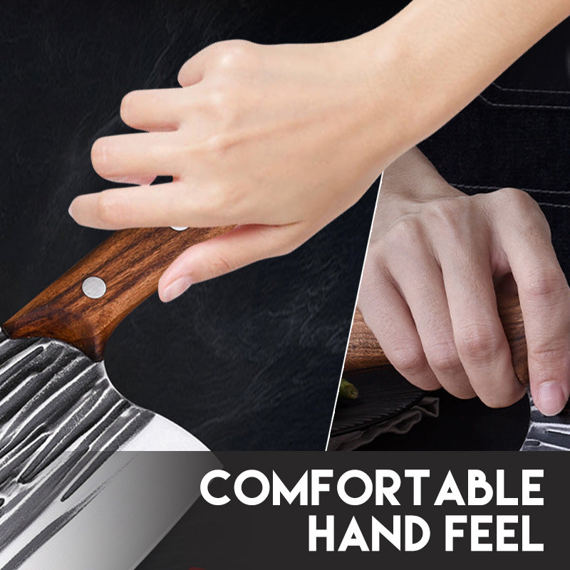 DUURZAAMHEID: Geforgeerd door voortdurende hamering en vouwen, heeft dit hakmes een kenmerkende gesmede textuur voor extra duurzaamheid. Deze eigenschap zorgt voor langdurige sterkte en een aantrekkelijke, robuuste afwerking.