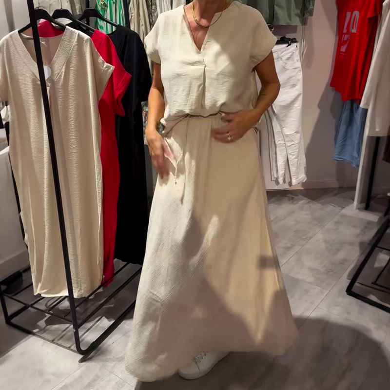 Verfijnde tweedelige zomeroutfit: basic V-hals top + coole rok